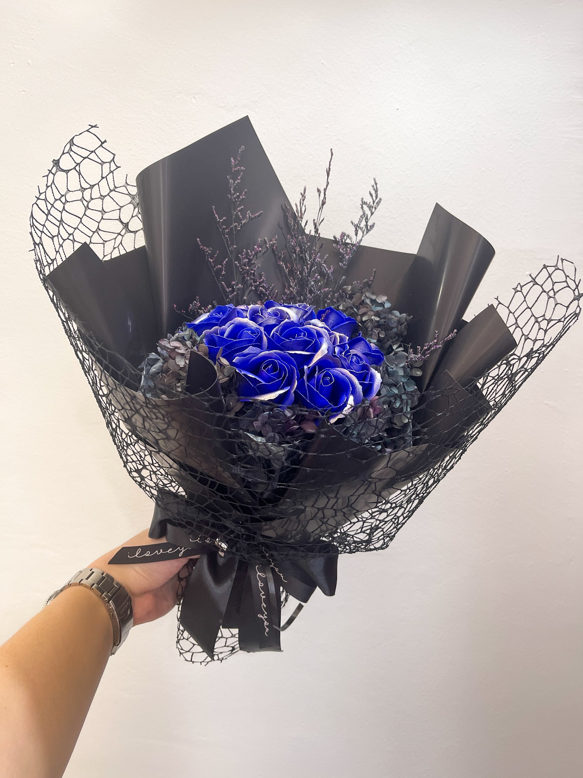 Dark Purpur features 12 meticulously arranged stalks combined with hydrangea and dried foliage, creating an aesthetically pleasing composition. This blend offers a subtle elegance suitable for diverse settings, enhancing visual appeal without compromising on longevity, as dried materials maintain their form and color over time.
