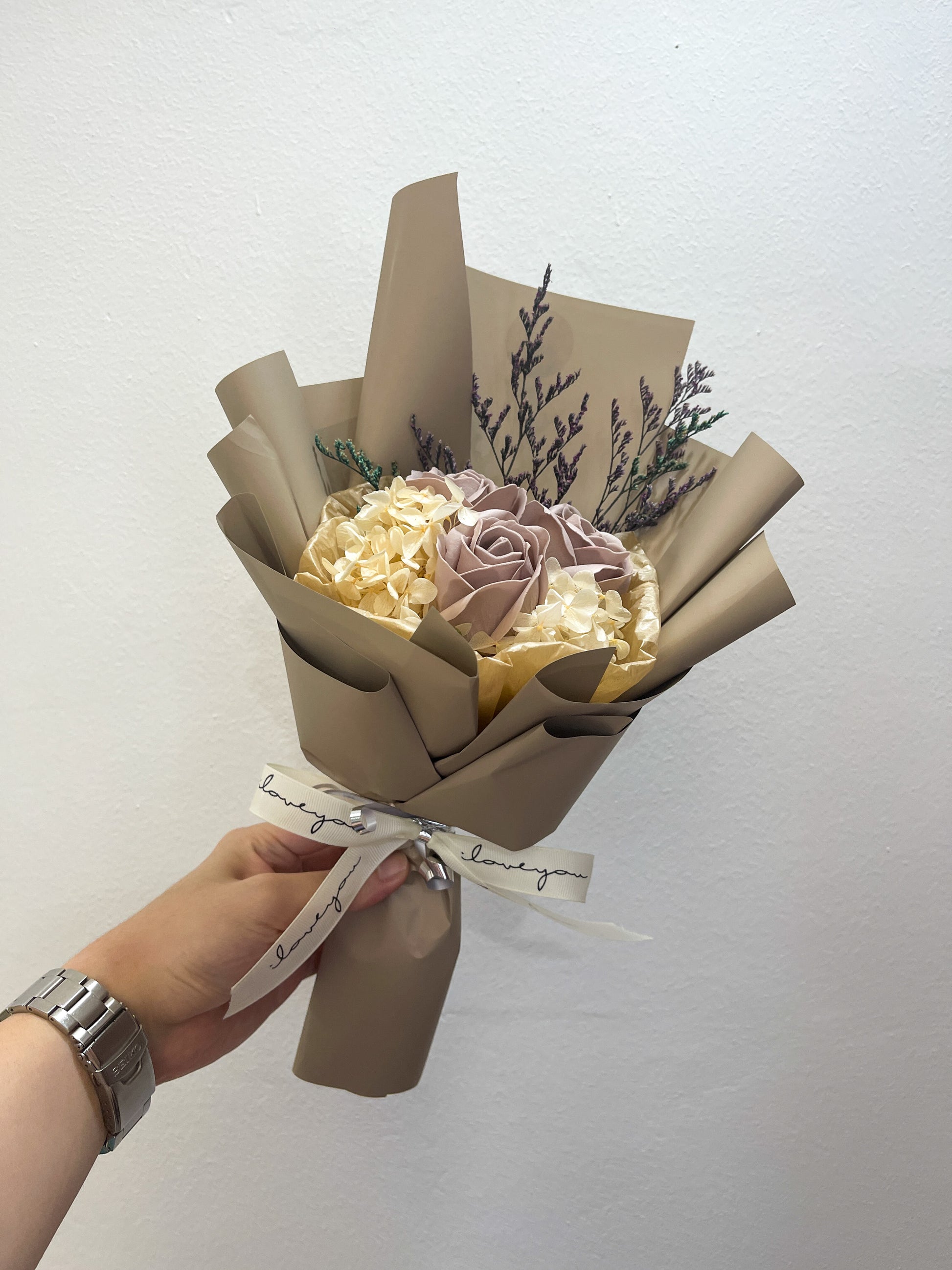 3 stalks complemented by hydrangea and dried foliage, providing a sophisticated aesthetic. The blend of textures enhances visual interest and stability, making it suitable for long-lasting decor. This combination promotes an earthy yet elegant atmosphere, ideal for various interior settings.