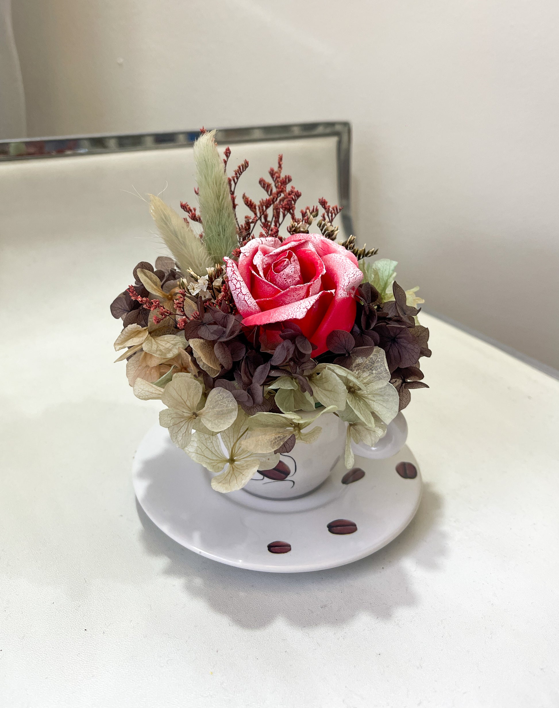 Single Rose arrangement decorated with preserved filler and dried foliage