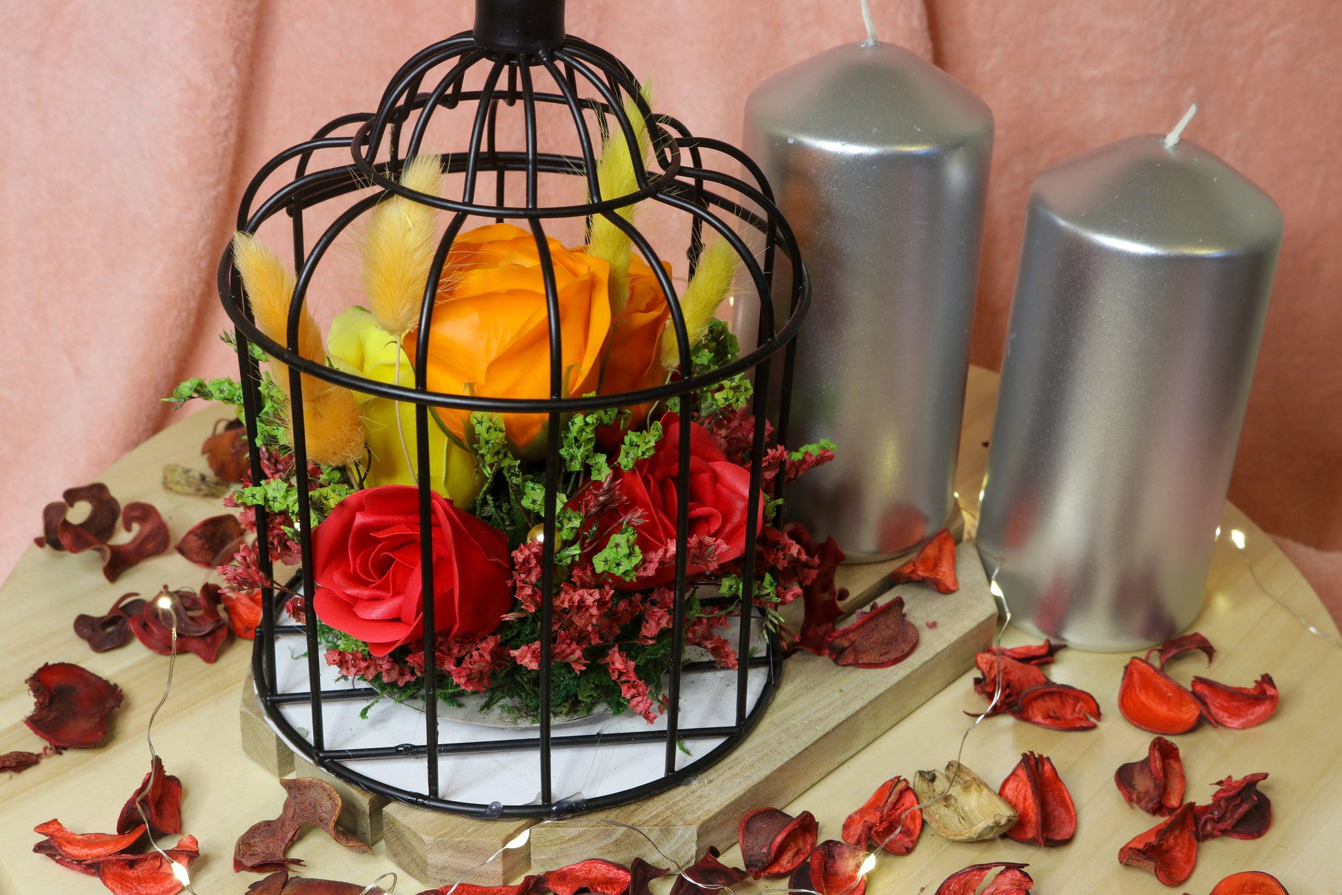 Filled with Various Coloured Roses, Cat tails and Caspia to fully showcase the Love Cage