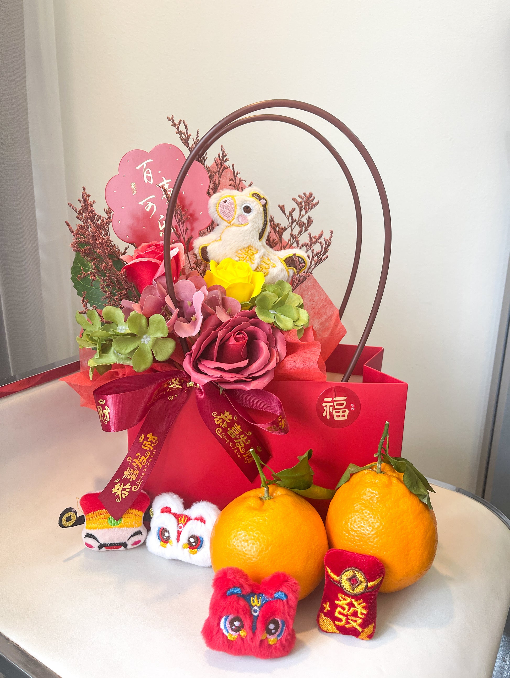 CNY Arrangement wrapped together with 2 Oranges and topped with a Horse Toy!