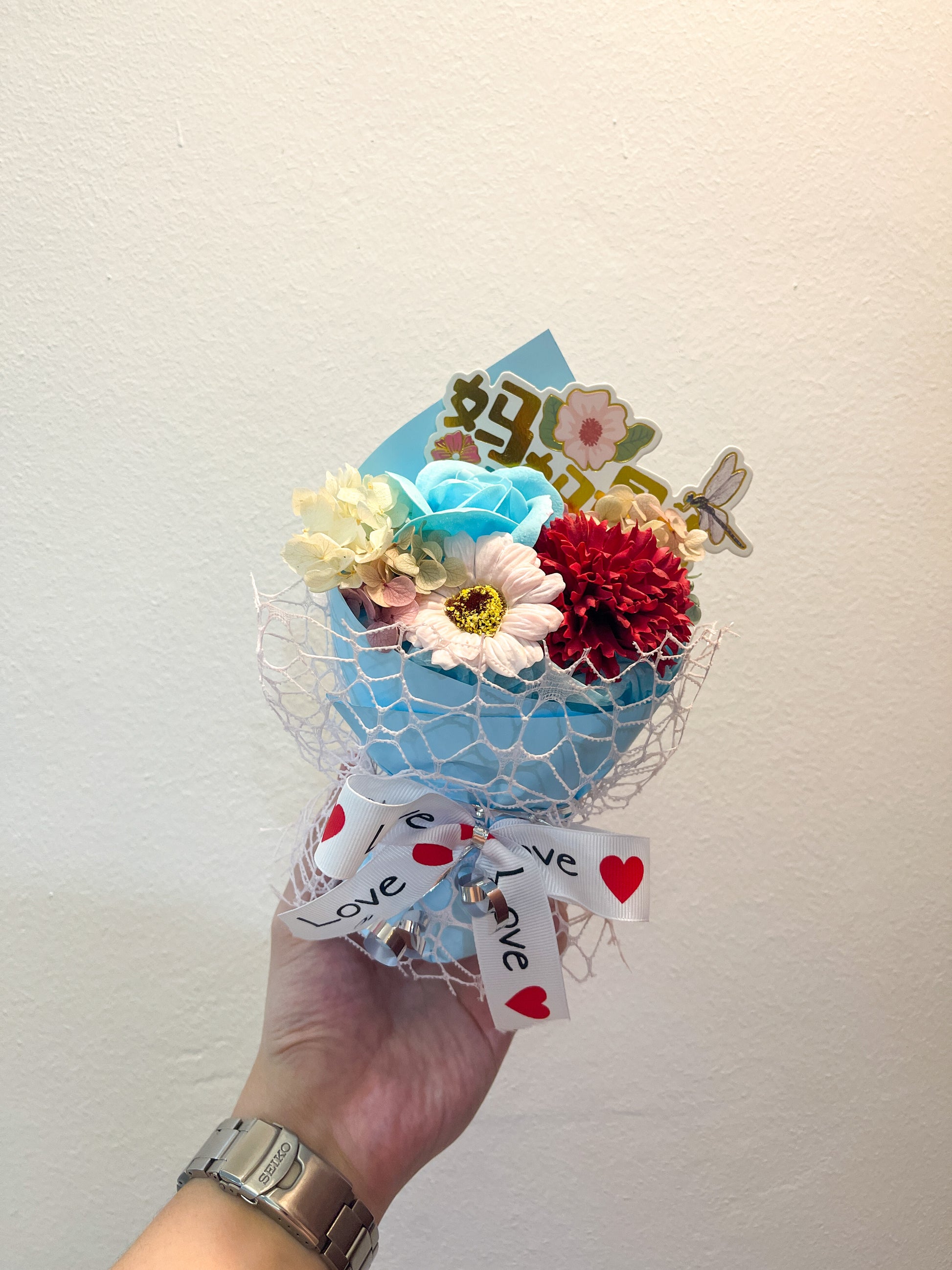 3 Stalks Soap Flowers mixed with preserved filler and dried foliage
