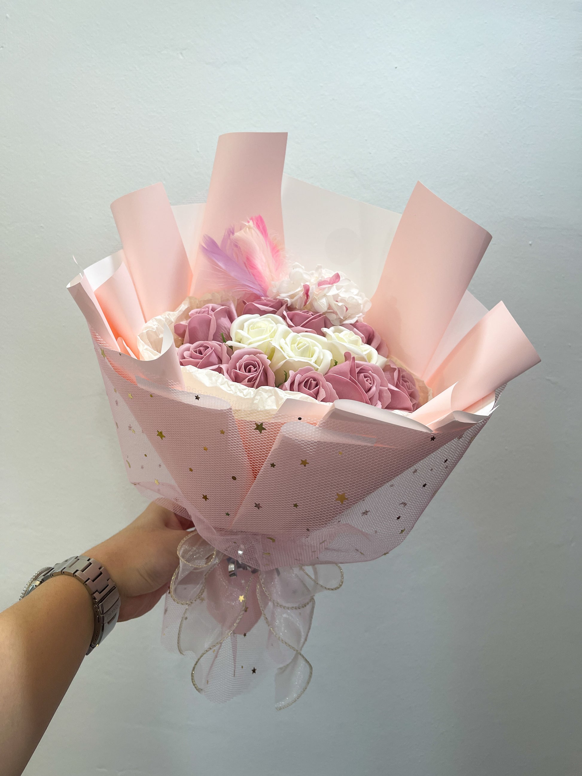 The Pink Panther arrangement consists of 12 carefully selected stalks, expertly combined with hydrangea and dried foliage. This composition offers a balanced aesthetic, providing both visual appeal and texture. The use of hydrangea contributes to longevity, as dried flora often retains its shape and color for extended periods, making this arrangement a sustainable choice for decor.