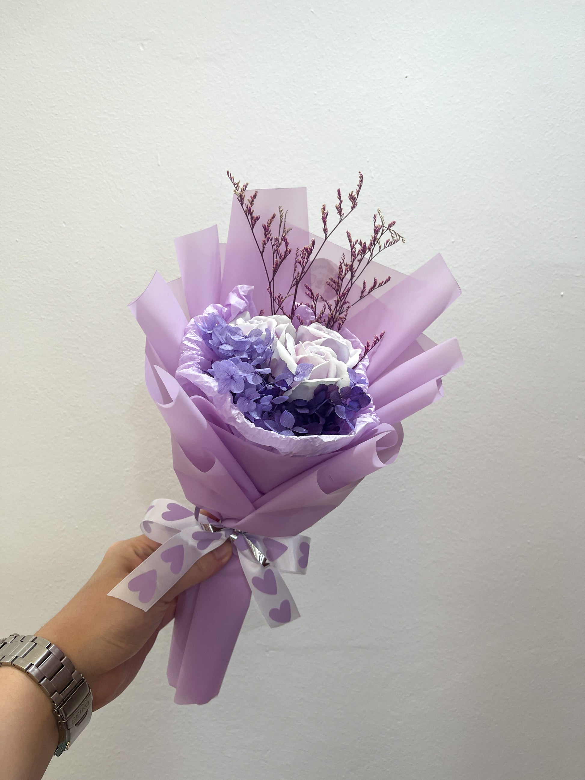 Slight Purple features 3 carefully arranged stalks, complemented by hydrangea and dried foliage. This combination provides a sustainable decorative option, with hydrangea known for its longevity and dried foliage offering a unique texture. Ideal for enhancing interior spaces, it balances aesthetic appeal with durability.