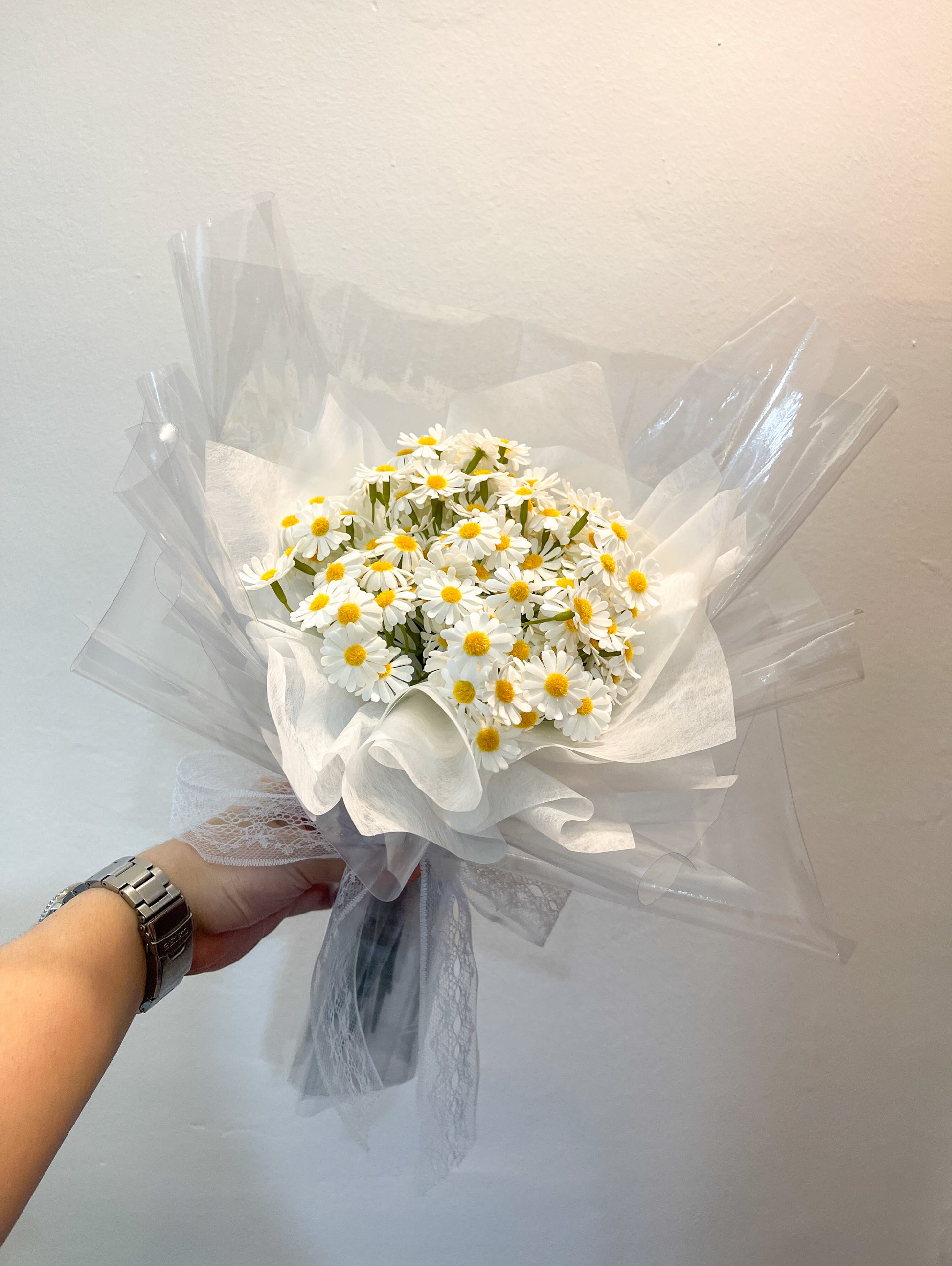 90 Stalks Daisies wrapped together with Transparent wrapping plastic to form a bouquet!